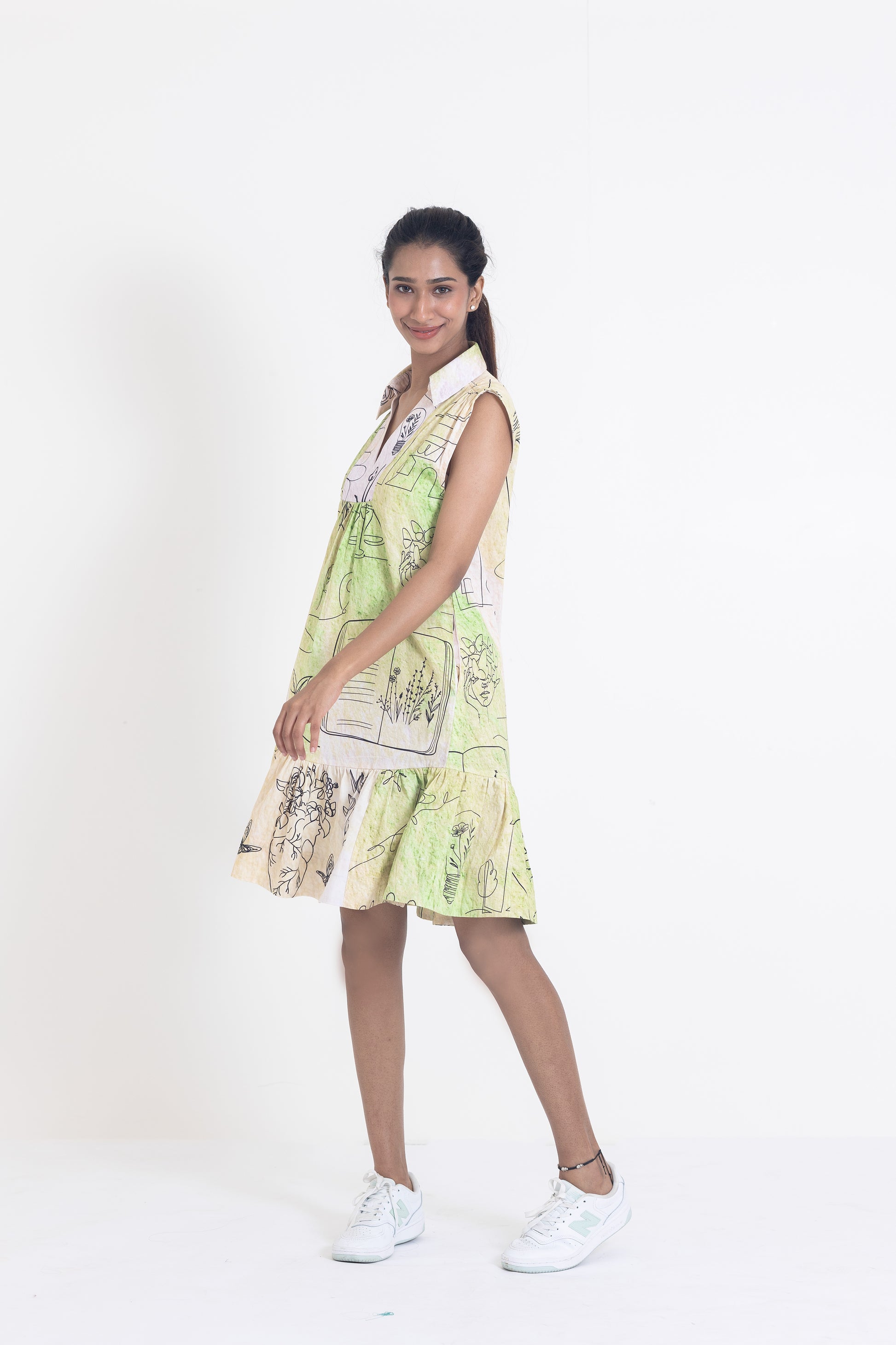 The print features abstract hand-sketched motifs in soothing green and pastel tones, giving the dress a modern, artistic feel. Finished with a structured collar, a relaxed fit, and a tiered hem, this piece blends comfort with creativity.
