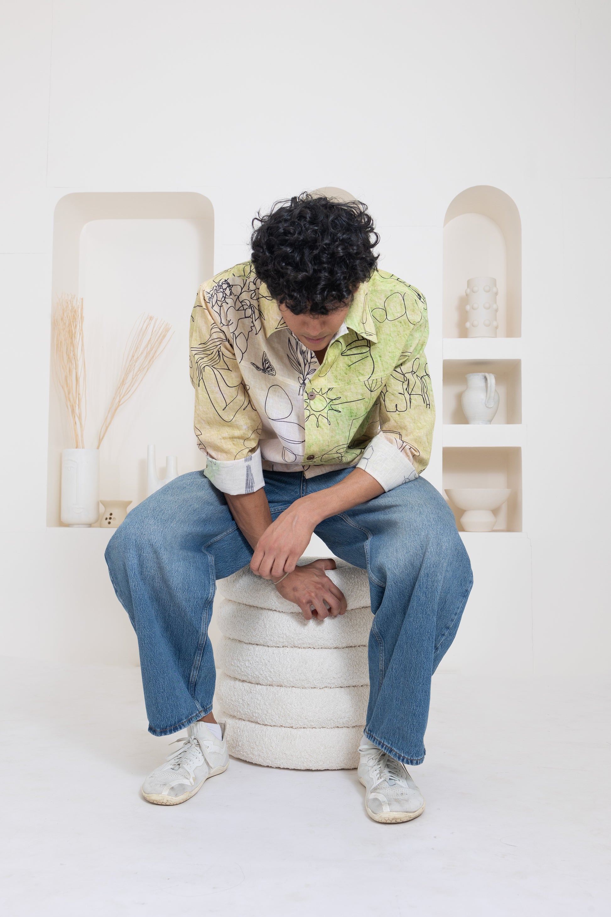 A canvas of quiet expression , The Line & Light Shirt is a unisex cotton piece illustrated with hand-drawn sketches that capture moments of stillness, connection, and imagination.